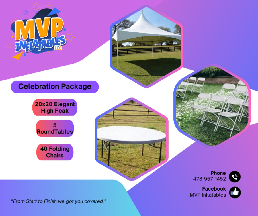 Make your next event effortless and elegant with the Celebration Package from Event Renal Essentials. This curated rental set includes a 20x20 elegant high peak tent, five round tables, and 40 white folding chairs. Perfect for weddings, birthday parties, family reunions, and corporate events — designed for style, comfort, and fast setup. 🎉